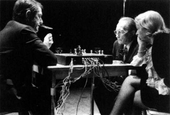 A scene of Duchamp, Teeny, and Cage playing chess in a performance, Sightssoundsystems, a festival of art and technology in Toronto, 1968