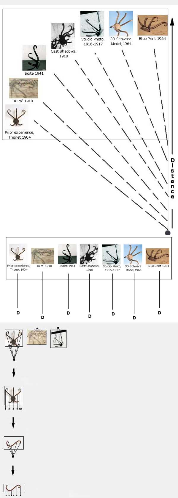 in 3B and 4B above Step 2-whole cut into parts Multiple perspectives (cuts) of 6 Duchamp Hatracks fused with observer's prior experience | ||