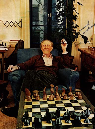Photograph of Duchamp sitting in front of a chess set designed by Max Ernst, 1968 © 2000 Succession Marcel Duchamp ARS, N.Y./ADAGP, Paris.