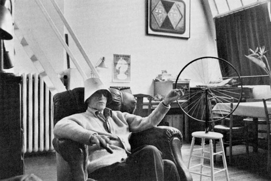 Photograph of Duchamp wearing a lampshade with Bicycle Wheel, 1951 © 2000 Succession Marcel Duchamp, ARS, N.Y./ADAGP, Paris